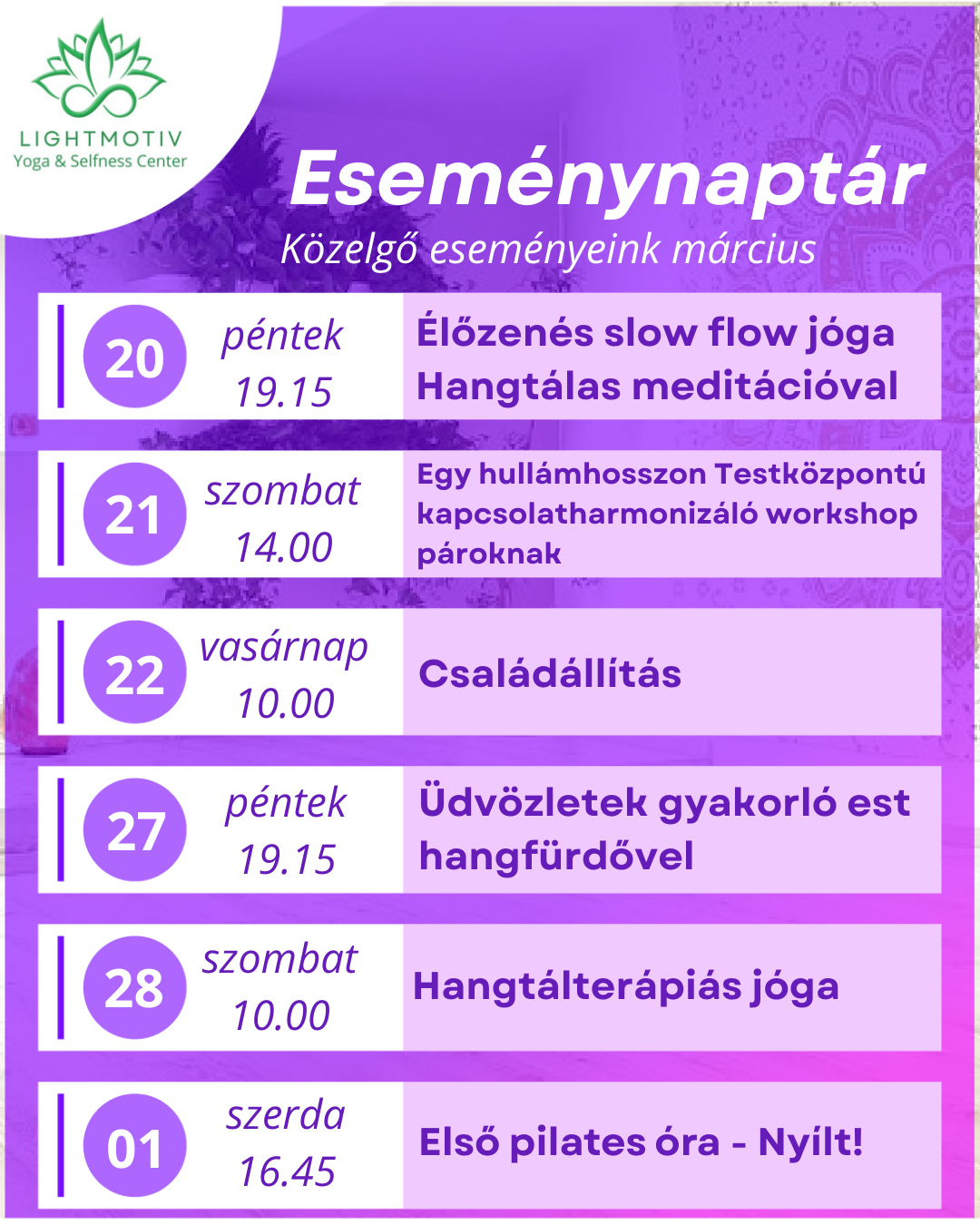 - Workshopjainkra, koncertjeinkre és hangfürdőinkre előző este 8 óráig kérjük a bejelentkezést, a minimum létszám elérése érdekében. Amennyiben nincs meg, az esemény automatikusan lemondódik.